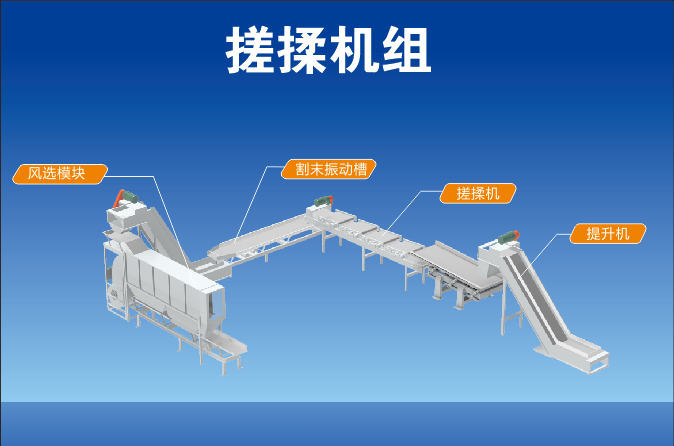 機(jī)組組成:本機(jī)組由提升機(jī)、搓揉機(jī)、割末振動(dòng)槽、風(fēng)選機(jī)、機(jī)組集成控制系統(tǒng)組成。